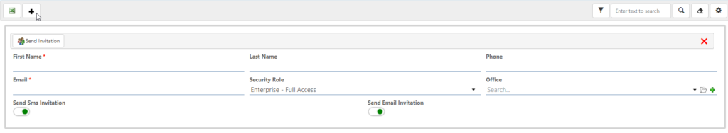 3. Fill in the user’s First Name, Last Name, Phone, Email, Security Role, and Office. Select whether to send the invitation link to the new Employee as a SMS message, Email, or both.