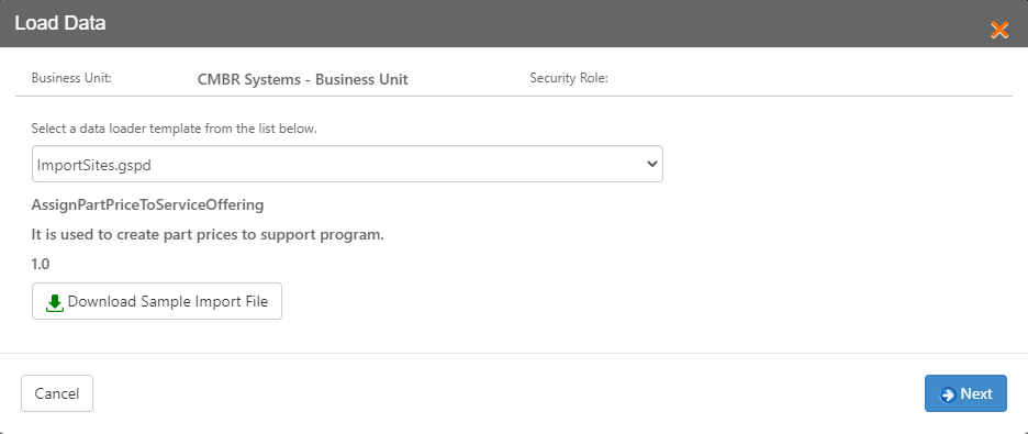 2. Select the Data Loader Template you will be using from the dropdown and click Next.