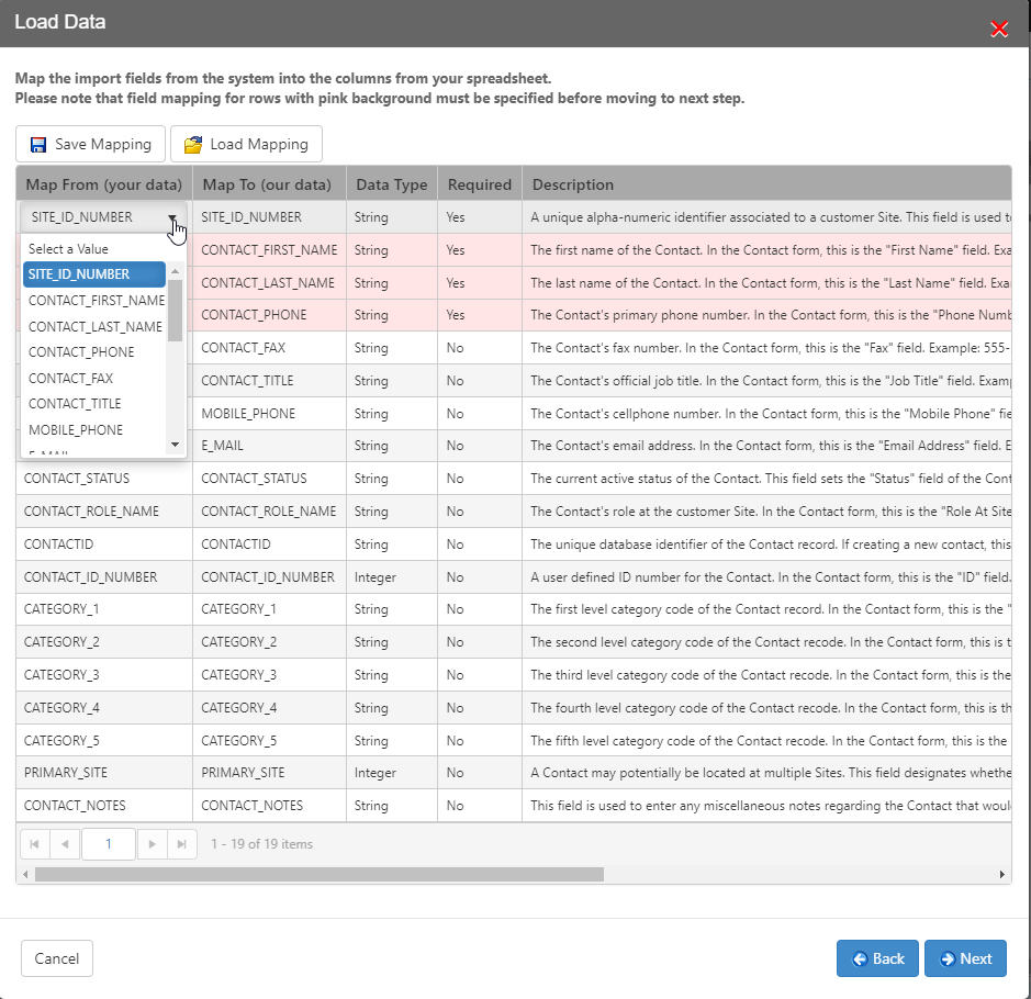 5. Use the dropdowns in the leftmost column to map the columns from your spreadsheet to the fields of the importer. This mapping can be saved and loaded to make future imports more convenient. Click Next.